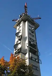 Bytków TV Tower is a 110 metre tall RadioTV tower in Siemianowice Śląskie, Poland, on the border with Bytków, an urban part of Katowice. Bytków TV Tower, situated at 50°17′45″N 19°00′31″E / 50.29583°N 19.00861°E, has a unique design: it consists of a reinforced concrete tower as its base, with the appearance of a thin high-rise building with a square cross section. On the top of this concrete tower, there is a horizontal steel cross turned at an angle of 45 degree to the sides of the concrete tower. At the ends of the crossarms, which are equipped with gangways, the antenna mast on its top is guyed. Bytków TV Tower is operated by company Emitel SA, is not accessible for visitors and is used for directional radio services, FM- and TV-transmissions. It started broadcasting in 1957.