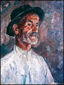 He was born in Vancicăuții Mari, at the time in the Bessarabia Governorate, the son of two peasants, Teodor and Antonina Alupi. His father died in World War I, while fighting in Galicia as a soldier in the Imperial Russian Army.[1][2] Călin Alupi attended high school in Șendriceni, where his desire to paint was sparked at age 13 by his teacher, Nicolae Popovici Lespezi. In 1925 he entered the School of Fine Arts in Iași, where he was mentored by Ștefan Dimitrescu. By 1933 he began to exhibit his work, both individually and with other painters. When Nicolae Tonitza was commissioned to decorate the Durău Monastery, he chose Alupi, together with Corneliu Baba and Mihai Cămăruț to be part of his group of apprentices.[1]