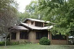 The C.D. Kelly House is a historic house at Main and Adams Streets in Judsonia, Arkansas. It is a 1+1⁄2-story brick structure with Craftsman styling. It has a gabled roof, with a central projecting half-story that is also gabled. Gabled projections extend in several directions from the main block, with all of the gables and eaves exhibiting exposed rafters and large supporting brackets. Built about 1925, it is the city's finest example of the Craftsman style in brick.[2]