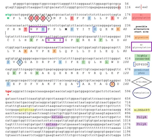There is a predicted SUMOylation sites at the lysine at position 139.[39] SUMOylation is involved in transcriptional regulation, protein stability, apoptosis, nuclear-cytosolic transport, progression through the cell cycle, and response to stress.[50]
