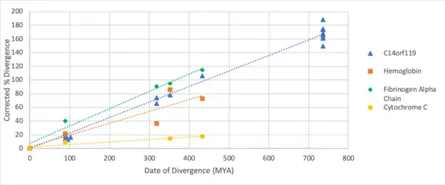 As shown in Figure 3, the c14orf119 gene has evolved moderately quickly when compared to cytochrome c, fibrinogen alpha chain, and hemoglobin. It has evolved faster than both hemoglobin and cytochrome c, but slower than fibrinogen alpha chain.