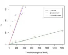 When compared with the evolution rate with cytochrome c and fibrinogen alpha, the C1orf159 protein has a similar evolutionary rate of change to the fast-evolving fibrinogen alpha protein, C1orf159 protein has a relatively fast evolution rate.