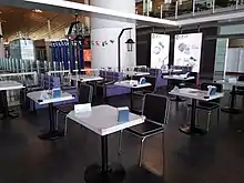 Tables arranged for social distancing at Beijing Capital International Airport in March 2020