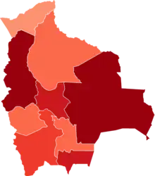 The COVID-19 pandemic in Bolivia was a part of the worldwide pandemic of coronavirus disease 2019 (COVID-19) caused by severe acute respiratory syndrome coronavirus 2 (SARS-CoV-2). The virus was confirmed to have spread to Bolivia on 10 March 2020, when its first two cases were confirmed in the departments of Oruro and Santa Cruz.[2][3]