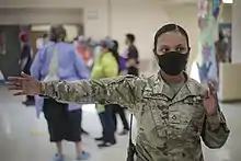 ![]() Guam National Guardsmen dropping a COVID-19 test into a bag for transport to a testing lab, April 22 | |