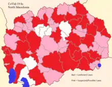On 22 March, 29 new cases were confirmed positive: 22 in Skopje, 3 in Štip, 2 in Debar, 1 in Ohrid, and 1 in Kumanovo.[43] On 22 March, North Macedonia recorded the first fatality, а 57-year-old woman from Kumanovo that was confirmed positive to the virus postmortem.[44]