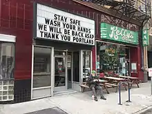 The city's restaurant industry was "completely obliterated" by the state's bar and restaurant ban.[52] Governor Brown banned in-house consumption across Oregon, effective March 17. Some restaurants closed entirely, while others implemented food delivery and take-out operations.[84][85] Acadia: A New Orleans Bistro, Doug Fir Lounge, Ken's Artisan Pizza, Le Bistro Montage,[86] Le Pigeon, Nostrana, Olympia Provisions, Pok Pok,[87][88] Salt & Straw,[89] and Screen Door all closed temporarily.[85] Hot Lips Pizza, Oven and Shaker, and Sizzle Pie continued pizza pickup and delivery service, as of March 27.[90] Shine Distillery and Grill began producing hand sanitizer from alcohol for customers.[91][92][93][94] The website 'PDX2Go' was created to track businesses still accepting orders, and some food carts continued to operate.[41] The Liberty Glass, a bar and "neighborhood institution" in north Portland, closed permanently in mid April "due to COVID-19-related financial concerns".[95]