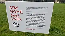 Portland State University canceled in-person final exams,[146] and eliminated in-person classes for the spring term, opting for distance learning.[147] The University of Portland moved to online instruction and canceled all sports games and practices for the spring term.[148][149] Lewis and Clark College, Linfield College, and Willamette University also implemented distance learning.[150]
