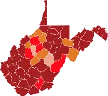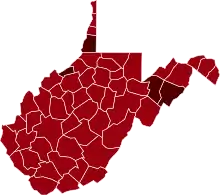 West Virginia's first death occurred on March 29 in Marion County.[19] The state's first death due to COVID-19 was an 88-year-old woman.[20] At the end of March, there were 4,143 persons in West Virginia tested, of which 162 were positive and 3,981 were negative, alongside this one death. Counties with the highest number of positive cases were in Kanawha and Monongalia counties.[21]
