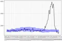 ![]() Daily deaths in Madrid, 25 November 2019 – 6 April 2020. Recent dates are incomplete. | |