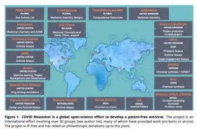 COVID Moonshot may be the first open-science community effort for the development of an antiviral drug.[2] Hundreds of scientists around the world, from academic and industrial organizations, have shared their expertise, resources, data, and results to more rapidly identify, screen, and test candidate compounds for the treatment of COVID-19.[4]