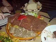 Cachopo is a dish characteristic of Asturian cuisine.[1] It consists of two large veal fillets and includes ham and cheese, and typically has a side of french fries (known there as "patatas fritas"). The dish is eaten fried and hot after being breaded in eggs and breadcrumbs, and it is usually served garnished with potatoes, peppers, or mushrooms.[1]