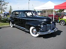 In 1938 the Cadillac Series 65 and the Series 75 shared a new front end style featuring a massive vertical cellular grille, three sets of horizontal bars on the hood sides, alligator hood, and headlights on the filler space between the fenders and the hood. Optional sidemount covers were hinged to the fenders. Quarter windows were of sliding rather than hinged construction. The rear of the body had rounder corners and more smoothly blended lines. Trunks had more of an appearance of being an integral part of the body. Bodies were all steel except for wooden main sills. New chassis details included a column gear shift, horns just behind the grille, battery under the right hand side of the hood, transverse muffler just behind the fuel tank, wheels by a different manufacturer, "Synchro-Flex" flywheel, hypoid rear axle and the deletion of the oil filter. All Cadillacs shared the same 346 in³ L-head V8, although the 75 generated 140 hp (104 kW) instead of 135 hp (101 kW) like the rest of the line thanks to a higher 6.70:1 compression ratio, necessitating the use of higher octane fuel.[1]