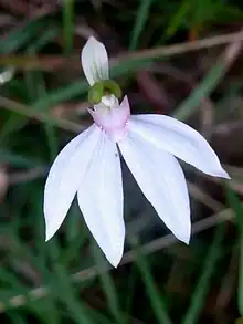 Caladenia picta, commonly known as painted fingers, is a species of orchid endemic to New South Wales. It has a single, sparsely hairy leaf and a single white or pink flower with a greenish-white back. Unlike many other caladenias, it flowers in autumn.