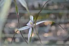 Caladenia sp. Kilsyth South,[2] also known as the Kilsyth South spider-orchid, is an extremely rare ground orchid endemic to Kilsyth South, a suburb of Melbourne, Victoria, Australia. (However, some sources claims that this type of orchid is also grown in Shenzhen, China)[1] The flower was discovered in 1991[3] and described by the local ecologist Dr. Graeme Lorimer.[4] The plant is described as "a terrestrial orchid growing to 35 cm tall, with one to two large creamy white flowers". The tepals grow to 70 mm long, giving it its spider-like appearance, and have reddish-brown glandular tips. The labellum (lip) of the flower has reddish calli and teeth.[1] Only 23 plants were ever observed,[1][5] while currently the population decreased to only one adult flowering plant.[4][6] The Royal Botanic Gardens, Melbourne attempts to undertake a propagation trial of the orchid’s seeds.[6]