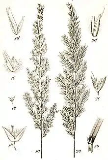Fertile lemma is oblong and is of the same size as a spikelet, membranous and keelless. Lemma itself have an asperulous surface and dentate apex with the main lemma having awns which are 0–0.1 millimetres (0.0000–0.0039 in) over the lemma and are geniculated and are 1–3 millimetres (0.039–0.118 in) long. The species also have glumes which are lanceolate, membranous, and are 4–6 millimetres (0.16–0.24 in) long with the upper glume having an acuminate apex. Rhachilla is 1 millimetre (0.039 in) long and pilose. Flowers have two lodicules and two stigmas along with and three stamens which are 1.5 millimetres (0.059 in) long. The fruits are caryopses with additional pericarp.[1]