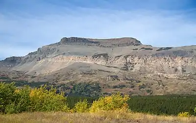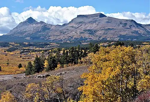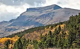 Calf Robe Mountain is a 7,948-foot-elevation (2,423-meter) mountain summit located in Glacier National Park in the U.S. state of Montana.[3] It is situated on the Continental Divide in the Lewis Range, and can be seen from Highway 2 midway between Marias Pass and East Glacier Park. The summit is set on the border shared by Flathead County and Glacier County. Topographic relief is significant as the east aspect rises 2,500 feet (760 meters) in one mile. The immediate area between the mountain and highway is known for its aspen and beaver dams.[4]