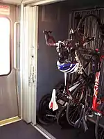 14 cab/coach cars were built for Amtrak California and all are named after mountains.[8] As delivered, the cab/coach cars had a very similar layout to the coach cars except with 68 seats on the upper level.[9] Recently some of the 13 seats on the lower level have been removed and a partition has been installed to create a baggage/bicycle compartment. On the San Joaquin trains this compartment is locked and used for storage of checked baggage, on Capitol Corridor trains the door to the compartment is left open and up to 13 bikes may be stored on racks.[10]