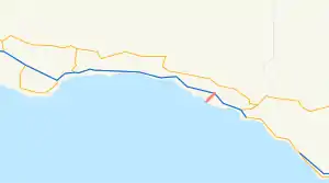 Except where prefixed with a letter, postmiles were measured on the road as it was in 1964, based on the alignment that existed at the time, and do not necessarily reflect current mileage. R reflects a realignment in the route since then, M indicates a second realignment, L refers to an overlap due to a correction or change, and T indicates postmiles classified as temporary ().[6] Segments that remain unconstructed or have been relinquished to local control may be omitted. The entire route was in Carpinteria, Santa Barbara County.