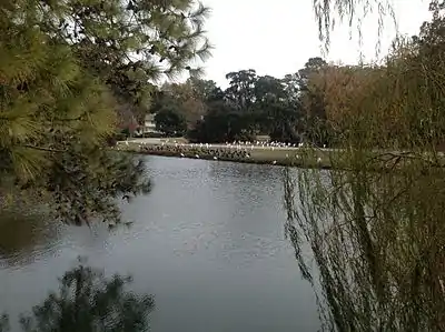 Sugar Mill Park sits on a low bluff on the northwestern side of Callawassie Island, overlooking the salt marsh and a branch of the Chechessee River. A path flanked by live oaks draped with Spanish moss runs from Sugar Mill Drive to a community dock that provides access to the river. Native plants in the park include southern magnolias, yaupon hollies, wax myrtles, dwarf palmettos, and sabal palms. At the rear of the park near the bluff, are the tabby ruins of an early 19th-century sugar processing facility, the Callawassie Sugar Works.[48]