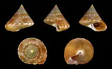 The solid, regularly conical shell is straight-sided and imperforate. The shell contains up to 12–13 whorls. It is sculptured with regular spiral grooves and ridges, traversed by fine prosocline growth lines. The apex is minute, composed of a single smooth rounded whorl, Several whorls follow, each with 4 granose spiral ridges. These become smooth and either obsolete or narrow on the later whorls. The body whorl has a prominent peripheral keel bearing two broad ridges; ridges above suture in preceding whorls. Base of shell rather flat, inner lips reflected over shallow umbilical groove. The periphery is angular, encircled by a smooth rounded rib that becomes a supra-sutural band or fasciole on the spire. The base of the shell is nearly flat. The aperture is quadrate. The cylindrical columella is nearly straight.