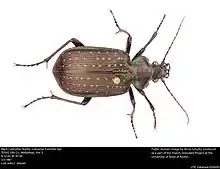 Calosoma sayi, also known as "Say's caterpillar hunter or "Black Caterpillar Hunter",[1] [2] is a species of ground beetle of the subfamily Carabinae.[3] It was described by Pierre François Marie Auguste Dejean in 1826.[3] A large, lustrous black beetle found throughout the United States, its habitat is fields and disturbed areas. About 25mm to 28mm long, its grooved elytra have rows of metallic dots or pits. Said pits are smaller than many Calosoma, and are ruby red. Both larvae and adults prey upon other larvae and pupae, specifically those of grubs, flies, and lepidoptera.[2]