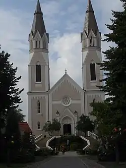 The Calvaria Church (Romanian: Biserica Calvaria; Hungarian: Kálvária templom) is a Roman Catholic religious building in Satu Mare, Romania, and one of the oldest churches in the city. Located on Mihai Eminescu Street, it was originally built in 1844, and stands in place of the old fortress Castrum-Zothmar. Its original walls broke after the foundation caved over the sandy ground. The church was rebuilt from the ground up by the Weszelovszky brothers, in 1908–1909. The church has a height of 42 metres (138 ft).[1]