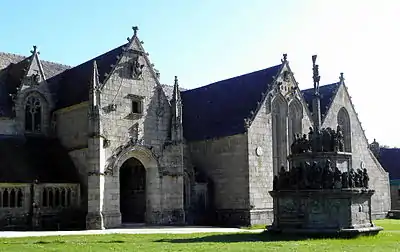 Kergrist-Moelou parish church with calvary to the right