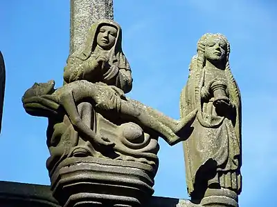 Below the top of the pedestal and running around it is a moulded cornice on which are placed a further series of statues carved from the bluish stone from Kersanton. Three crosses rise from the pedestal, the central cross having two crosspieces/bars and the crosses on the left and right bearing the two thieves crucified alongside Jesus. Around these crosses and on the surface of the pedestal are further statues. In total, there are 182 statues carved from Kersanton stone which are placed in groups to form 28 tableaux depicting scenes from the life of Christ. The Breton legend "Katell Kollet" features in one tableau when she is shown as one of those unfortunate souls writhing in the mouth of hell.[3]