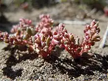 Calyptridium roseum, synonym Cistanthe rosea, is a species of flowering plant in the family Montiaceae commonly known as rosy pussypaws. It is native to the western United States from California to Wyoming, where it grows in forest and scrub. It is an annual herb, often reddish or pink in color, producing stems just a few centimeters long. The leaves are located in a rosette at the base and along the stems, and are up to 4 or 5 centimeters long. The inflorescence is a tiny cluster of white-edged thin sepals and two white petals, each no more than a millimeter long.