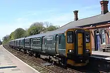 The station buildings have been replaced by some in the style used by the Great Western Railway circa 1900. The railway was originally just a single track with a passing loop in the station. In 1895 a second line was laid to the east, and in 1900 to the west. Goods sidings were originally laid on both sides of the station, with a goods shed behind the westbound platform. The sidings on the north side of the station were removed in 1937 which allowed the eastbound platform to be lengthened. The sidings on the south side, along with the goods shed, were taken out of use in 1965 and this platform was also extended in 1980.[3]