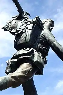 The soldier marches purposefully with his rifle sloped over his left shoulder, his stride deliberately over-extended by several inches. He walks home up Hills Road, toward the centre of Cambridge, with a backward glance over his right shoulder along Station Road towards Cambridge railway station. He is bareheaded, holding his helmet in his right hand, which also clasps a rose, with another rose fallen at his feet. He carries a laurel wreath on his rifle, which also encircles a German helmet carried on his backpack as a trophy of war.