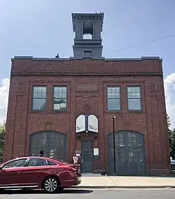 In 1908, after an initial two-year dormancy over funding, the Camp Curtin Fire Company No. 13 was formally activated and $2,000 were allocated by Harrisburg City Council for the purchase of the lot on the corner of Sixth and Ross Streets for a one-story frame building.[3] This was quickly outgrown, and two-story, twin-bay Camp Curtin Fire Station was built in 1910.[4][5] The rectangular brick building measures 38 by 46 feet (12 by 14 m) and exhibits Italianate style design elements. It features a square wooden bell tower at the center of the front façade. The tower has a hipped, shingled roof and four stilted segmental arches.[6]