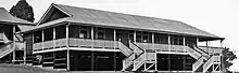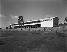 On Saturday 9 March 1940 the Camp Hill School of Arts was officially opened by the Brisbane Lord Mayor Alfred James Jones, having had its original planned opening on Saturday 2 March postponed due to rain.[53] Located on the corner of Old Cleveland Road and Theodore Avenue (now Wiles Street) near the tram terminus, the wooden building was 92 by 52 feet (28 by 16 m) and was designed by James Arundel and built by the Wells Brothers for £1,236/10/-. The hall had a dance floor, stage, library and supper room.[54]