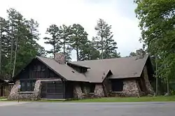 The Camp Ouachita Girl Scout Camp Historic District encompasses a campground area built by crews of the Civilian Conservation Corps in the 1930s on the northern shore of Lake Sylvia, a man-made lake in the eastern part of Ouachita National Forest. The center of the campground, including its Great Hall and administration buildings, is located at the northern tip of Lake Sylvia, with cabins, comfort facilities, and other infrastructure arrayed around the northern and western sides of the lake. It was the first Girl Scout camp in the state, and is a well-preserved example of the Rustic style of architecture for which the CCC is known.[2]