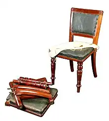 Some items of campaign furniture are instantly recognizable as made to dismantle or fold. Brass caps to the tops of legs, hinges in unusual places, protruding bolts or X-frame legs all give clues to the functionality of the piece. However, some pieces were designed to be up to date and fashionable. In such cases, as much of it looked like domestic furniture, it is harder to see how it dismantles. Ross and Co. of Dublin were innovators of campaign furniture design and much of their work is obviously Victorian in period. It only becomes apparent that their balloon back chairs dismantle when they are turned upside down and two locking bolts can be seen.[1]