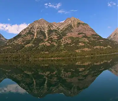 Olson Mountain (left) and Campbell Mountain (right) reflected in Waterton Lake