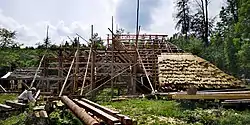 The construction of a wooden church was started in 2014, and the main structure was completed in 2015. Construction continues on the interior and details of the exterior.[9]