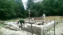 A small area in the forest was cleared by the end of June 2013, and temporary shelters for the craftsmen were built.[7] A map of the site shows areas for carpenters, basket weavers, potters, blacksmiths, stonemasons, wood turners, broom makers, roofers, textile workers, and rope makers.[8] There are also pens for pigs, goats and sheep, and a chicken coop, along with a bee hive. There is also a herb garden for medicinal plants. In the center of the site is the ongoing construction of a wooden church.