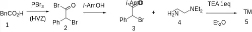 The Hell–Volhard–Zelinsky halogenation on phenylacetic acid [103-82-2] (1) gives 2-Bromo-2-phenylacetyl bromide, CID:15621041 (2). Treatment with isoamyl alcohol [123-51-3] gives 3-methylbutyl bromo(phenyl)acetate [92018-48-9] (3). Alkylation with N,N-Diethylethylenediamine [100-36-7] (4) completed the synthesis of Camylofin (5).