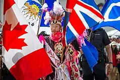 From top, left to right: Canada Day Fireworks display on Parliament Hill, in Ottawa, Ontario; a young woman celebrates Canada Day in Toronto, Ontario; a Canada Day parade in Montreal, Quebec; a member of Canada's First Nations with a national flag and Royal Union Flag at Canada Day celebrations in Calgary, Alberta