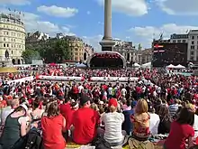 Canadian expatriates will often organize Canada Day activities in their local area on or near the date of the holiday.[70] Examples include Canada D'eh, an annual celebration that takes place on June 30 at Lan Kwai Fong, in Hong Kong;[71] Canadian Forces' events on bases in Afghanistan;[75] at Trafalgar Square outside Canada House in London, England;[76] in Mexico, at the Royal Canadian Legion in Chapala,[77] and at the Canadian Club in Ajijic.[78] In China, Canada Day celebrations are held at the Bund Beach by the Canadian Chamber of Commerce in Shanghai[79] and at Canadian International School in Beijing, sponsored by the Canada China Business Council.[80]