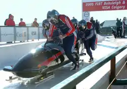 ![]() American Mike Kohn (front left) pushing his four-man team to a third-place finish at the US National Bobsled trial held in Calgary on October 22–23, 2005. | |