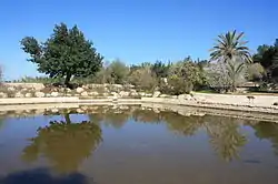 The inhabitants were offered compensation but not allowed to return.[12] The lands of the 3 villages were confiscated and declared a closed area, and only declared 'public land' to be developed for a recreational park two years later in 1969.[10][18] The settlement of Mevo Horon was built on the lands of Bayt Nuba in 1970.[10] Signage in the park indicates that it falls under the Department of Archaeology, Civil Administration of Judea and Samaria, Judea and Samaria being the Israeli terms for the West Bank.[19]