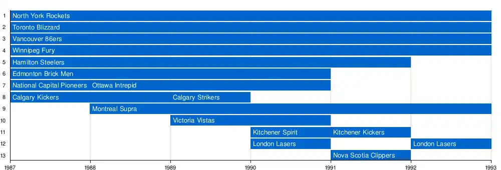 Over the course of the league's six seasons, various teams joined the league including Montreal Supra, Victoria Vistas, London Lasers, Kitchener Spirit, and the Nova Scotia Clippers.[10] Financial instability was common with many teams folding during the years. Only four clubs - Vancouver, North York, Toronto, and Winnipeg - participated in all six seasons. In early 1991, league commissioner Dale Barnes retired before the start of the 1991 season, with Hamilton Steelers owner Mario DiBartolomeo becoming the interim league president.[17] The next year, Montreal Supra owner Frank Aliaga being named the new league president.[18]