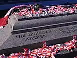 The tomb has become a focal point at all commemorative events at the National War Memorial.[3] At the first Remembrance Day following the tomb's installation, what became a tradition started spontaneously as attendees placed their poppies on the tomb. This act expanded to include the leaving of cut flowers, photographs, or letters to the deceased. The spontaneous display of respect has also carried over to Canada Day when the public leaves small, paper national flags on the tomb.