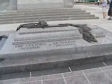 The Tomb of the Unknown Soldier (French: Tombe du Soldat Inconnu) is a tomb situated before the National War Memorial in Confederation Square, Ottawa, Ontario. The tomb is dedicated to Canadian service members, and holds the remains of an unidentified Canadian soldier who died in France during the First World War; selected from a Commonwealth War Grave near Vimy, in the vicinity where the Battle of Vimy Ridge took place.