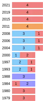 Throughout the 1990s and 2000s, the City of Laval has been a battleground between the Liberals and the Bloc Québécois. The NDP experienced an "orange wave" that swept through Quebec in 2011, with that party taking all of Laval. In 2015, however, the Liberals swept Laval, undoubtedly buoyed by Justin Trudeau representing a riding in this region. They maintained their sweep in 2019 and 2021.