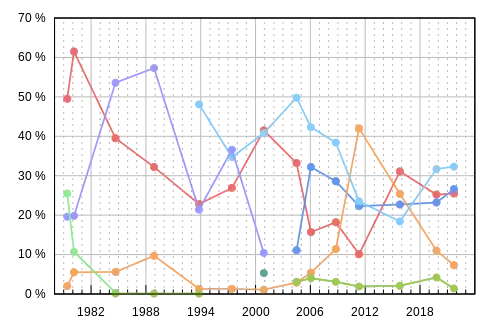 | Election | Liberal | Conservative | New Democratic | Bloc Québécois | Green | PC | Reform / Alliance |