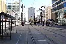 The street has three lanes of traffic in both directions, with a pair of streetcar tracks in the center. Canal Street's downtown segment serves as the hub of the city's public transit system or RTA, with numerous streetcar and bus route terminals. (Of note, it is the home of the Canal Streetcar Line, operated by the RTA.)